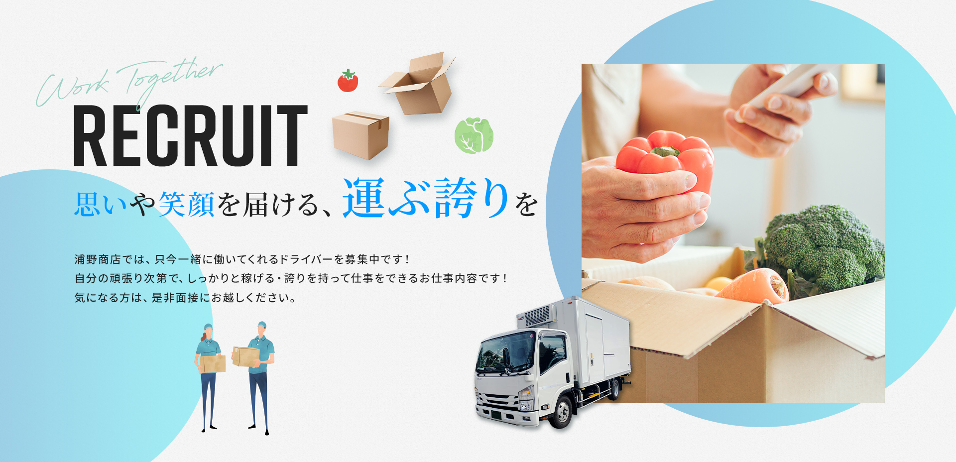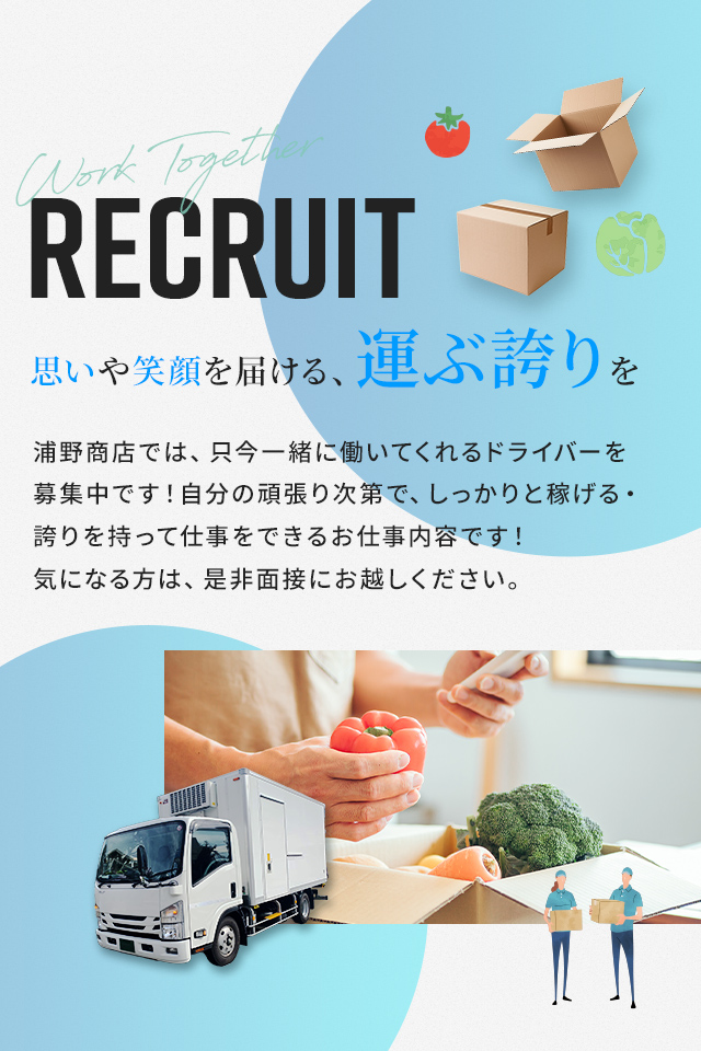 浦野商店では、ドライバーの募集を積極的に歓迎しておりますが、ドライバーといえば一人の時間が多くマイペースに働くこともできる環境です。もちろん仕事の時間や青果は責任もって運んでいただける方を募集しておりますが、仕事をしっかりと丁寧に行っていただければ、あとはのびのびと一人時間も楽しみながら働いていただけます!